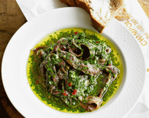 Dissalare in abbondante aceto e diliscare accuratamente 16 acciughe sotto sale e metterle allineate su un piatto di portata. Poi preparare la salsa verde per napparle, tritando finemente (meglio con la mezzaluna ma se andate di fretta anche con il frullatore) 2 spicchi di aglio, 2 manciate di prezzemolo e i tuorli di 2 uova precedentemente rassodate. Mettere il trito in una ciotolina e aggiungere 1 bicchiere di olio extravergine d’oliva, 2 cucchiai di aceto bianco, un pizzico di peperoncino e sale. Amalgamare bene con una forchetta e disporre la salsa sulle acciughe, coprendole completamente. Lasciare riposare almeno 6-7 ore prima di servire.
