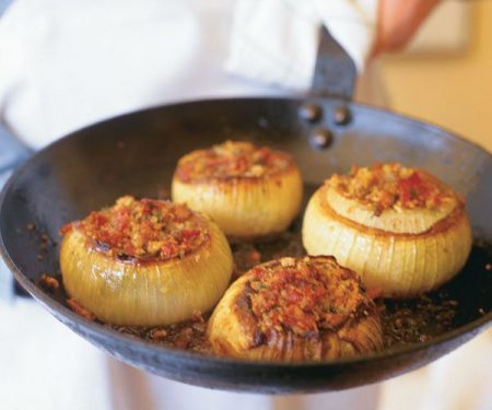 Lessare 8 cipolle di media grandezza fino a metà cottura, poi scolarle, tagliare la calotta superiore, svuotarle e tritare la polpa. Lessare anche 1 carota e 1 zucchina. In una ciotola sbriciolare 16 fette di pan carré con 1/2 bicchiere di latte, 200 grammi di mortadella tritata, 100 grammi di parmigiano grattugiato, 2 uova, 1 spicchio d’aglio, 1 cucchiaio di erba cipollina tritata, sale e pepe. Aggiungere anche 20 olive nere tritate, la carota tritata, il verde della zucchina tagliato finissimo, la polpa macinata delle cipolle e amalgamare con cura. Riempire con il composto le cipolle, sistemarle in una pirofila unta con olio, cospargerle con parmigiano e metterle in forno già caldo a 180 °C. Bagnare con 1/2 bicchiere di grappa e lasciarla evaporare, poi proseguire la cottura per 15 minuti circa (la superficie deve risultare dorata).