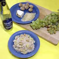 Soffriggere 1 scalogno nel burro. Poi unire degli champignons tagliati sottili e il riso. Spruzzare con vino bianco e portare a cottura aggiungendo brodo poco alla volta. Spegnere il fuoco, aggiungere burro, formaggio grana grattugiato, prezzemolo tritato e acini d’uva spellata e senza semi.