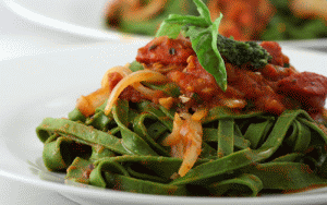 Frullare la parte bianca di 1 cipollotto novello, 1 peperone rosso medio, 150 grammi di pomodorini (strizzati per eliminare i semi) e 1 peperoncino rosso fresco con 1 pizzico di sale. Versare il tutto in una terrina unire le foglie di 1 mazzetto di basilico, 30 grammi di parmigiano e 3-4 cucchiai di olio, mescolando bene. Cuocere 350 grammi di tagliatelle verdi all’uovo, condirle con la salsa e guarnire con parmigiano, pezzetti di pomodoro e anelli di cipollotti.